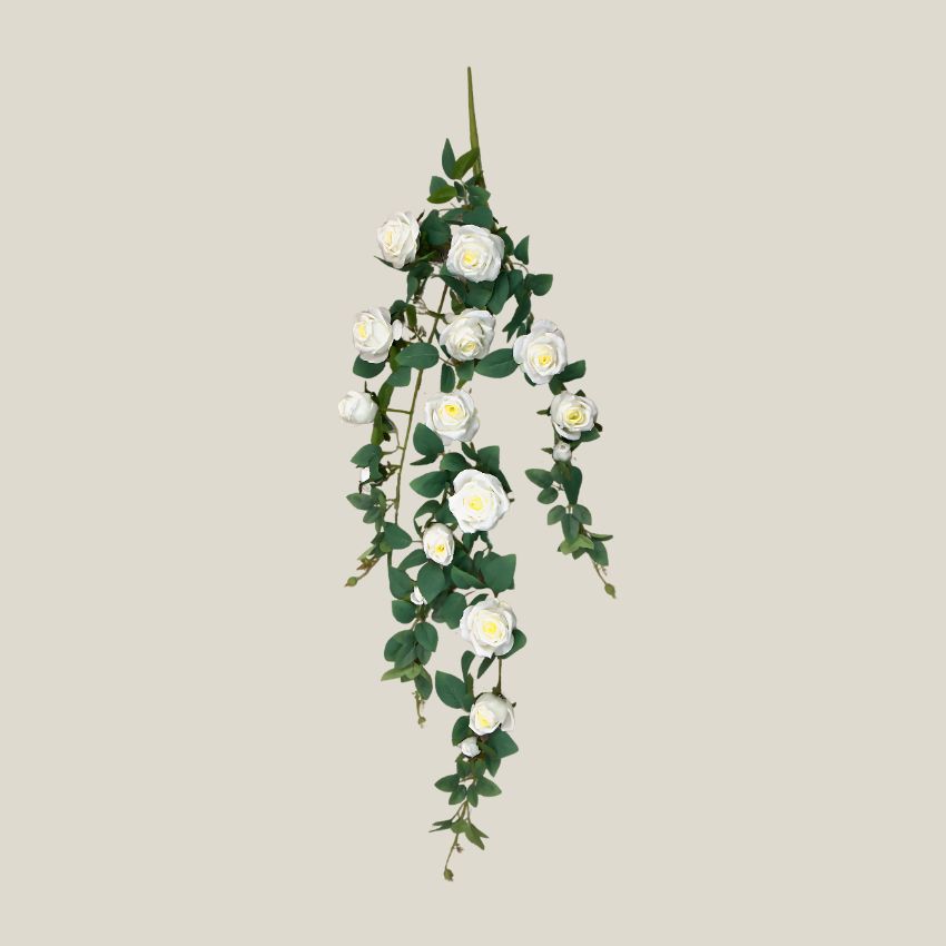 Transforma cualquier ambiente con esta delicada mata colgante de flores en tono Blanco nieve, perfecta para aportar un toque etéreo, fresco y sofisticado a tus espacios. Su diseño fluido y su color suave evocan la belleza de la naturaleza en su forma más sutil. Laborada con flores en seda de alta calidad y un tallo flexible, esta mata cuelga con gracia, ideal para ser usada en arcos florales, marcos decorativos, cortinas botánicas o centros colgantes.