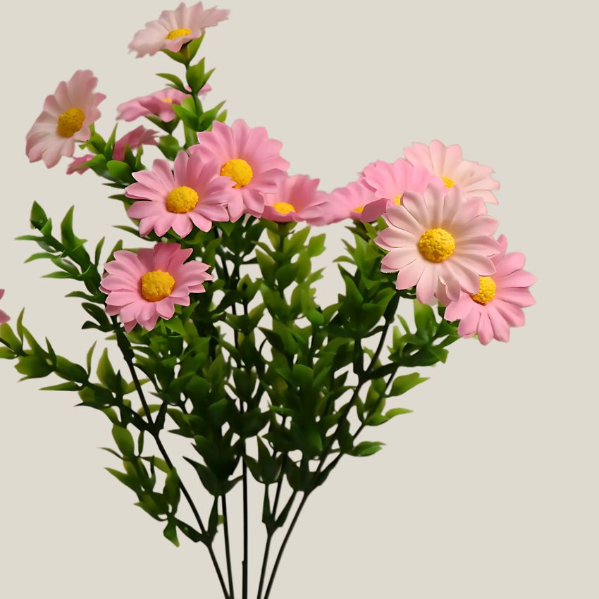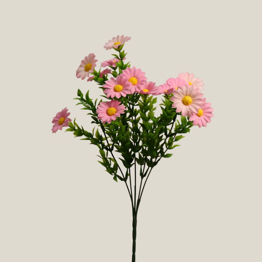 Este delicado ramo de margaritas mini en tono Rosa claro es perfecto para quienes desean añadir un toque de ternura, frescura y feminidad a su decoración. Su apariencia natural y su tamaño compacto lo hacen ideal para espacios acogedores y detalles sutiles llenos de encanto. Cada margarita ha sido cuidadosamente elaborada en seda suave, con pétalos definidos y tallos finos que imitan a la perfección las flores naturales, sin preocuparse por el riego o el marchitamiento.