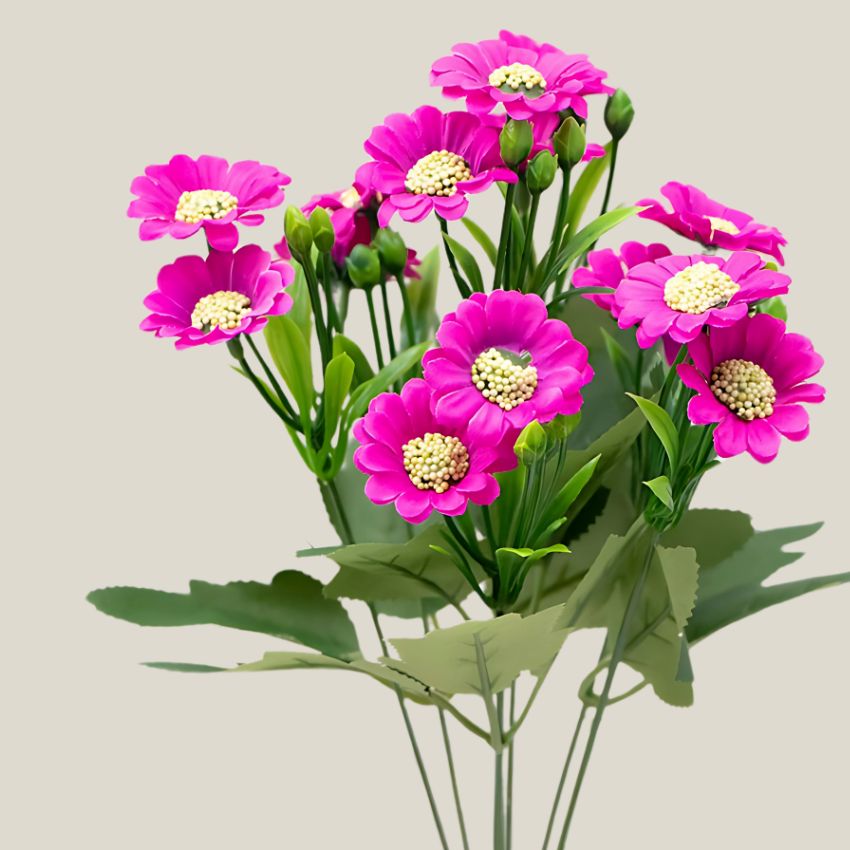 Este delicado ramo de margaritas mini en tono Fucsia es perfecto para quienes desean añadir un toque de ternura, frescura y feminidad a su decoración. Su apariencia natural y su tamaño compacto lo hacen ideal para espacios acogedores y detalles sutiles llenos de encanto. Cada margarita ha sido cuidadosamente elaborada en seda suave, con pétalos definidos y tallos finos que imitan a la perfección las flores naturales, sin preocuparse por el riego o el marchitamiento.
