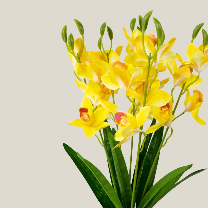 Ramo de orquídea artificial en tono amarillo zinc, ideal para crear arreglos luminosos, modernos y llenos de presencia. Gracias a su material en silicona, ofrece una textura suave y realista que imita perfectamente el movimiento y acabado de una orquídea natural.